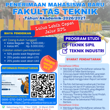 Selamat datang di situs Fakultas Teknik Univet Bantara Sukoharjo. Fakultas Teknik berdiri sejak Tahun 1993. Ada 2 program studi Teknik Sipil dan Teknik Industri yang didukung oleh dosen-dosen berkompeten dan profesional dibidangnya serta sarana, prasarana yang memadai dan berkualitas.